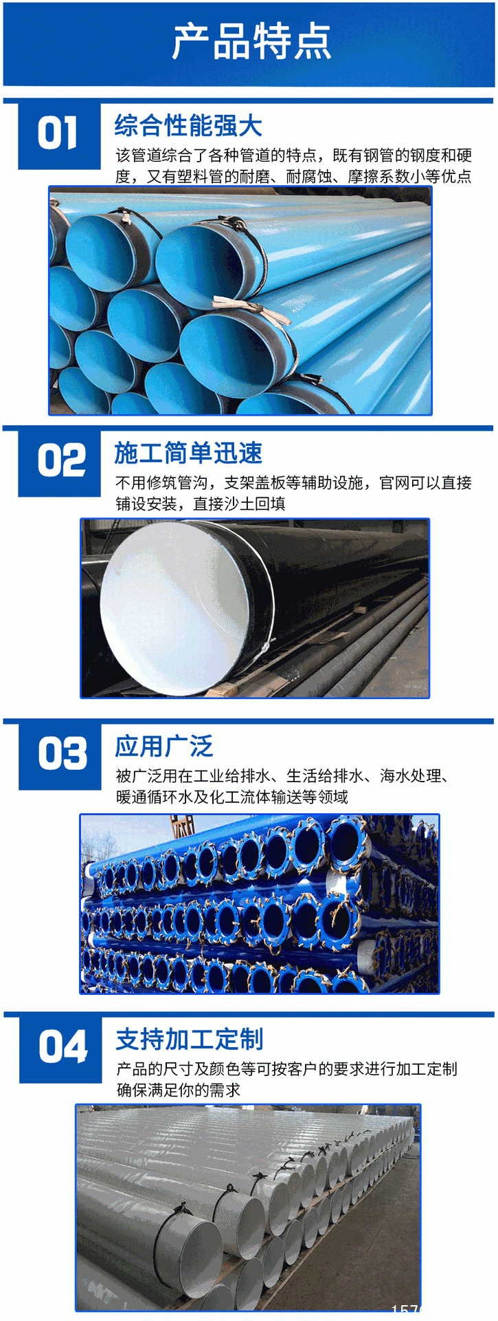• 涂层材质:常用的涂层材料有聚乙烯(PE)和环氧树脂(EP),这两种材料具有良好的耐腐蚀性、卫生性和耐磨性等特点。